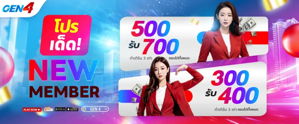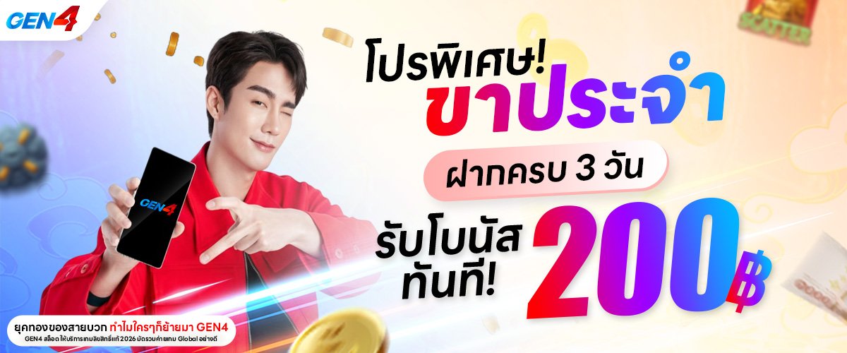 โปรโมชั่น เจน4 รวมโปรเด็ดจาก GEN4 ทั้งโบนัสสมาชิกใหม่ โปรฝากรับเพิ่ม คืนยอดเสีย และกิจกรรมพิเศษ แจกจริงทุกยูส เพิ่มทุนให้สายปั่น เล่นมันส์ กำไรปังตลอด 24 ชม.